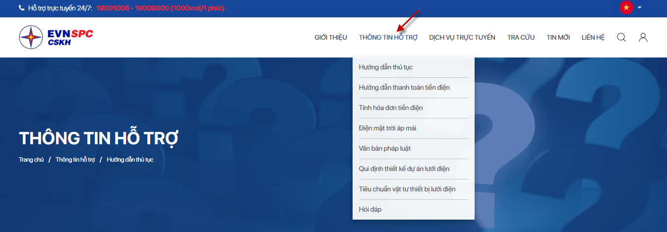 Trong phần thông tin hỗ trợ Khách hàng có thể tìm hiểu về các thủ tục, cách thức thanh toán tiền điện, cách tính hóa đơn tiền điện, các thông tin về điện mặt trời áp mái, qui định thiết kế dự án lưới điện, tiêu chuẩn vật tư thiết bị điện và các câu trả lời thường được Khách hàng quan tâm.