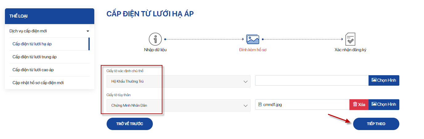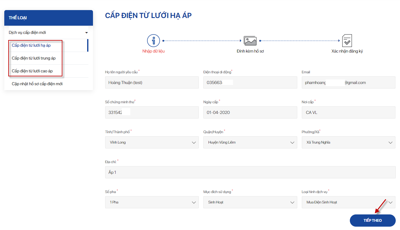 Khi có nhu cầu cấp điện mới, Khách hàng chọn vào phần “Dịch vụ cấp điện mới”. Trong giao diện cấp điện mới tùy theo nhu cầu mà Khách hàng có thể chọn là cấp điện từ lưới hạ áp, cấp điện từ lưới Trung áp, cấp điện từ lưới cao áp (tùy chọn bên trái màn hình). Sau khi chọn khách hàng điền đầy đủ thông tin theo yêu cầu và bấm vào “TIẾP THEO”