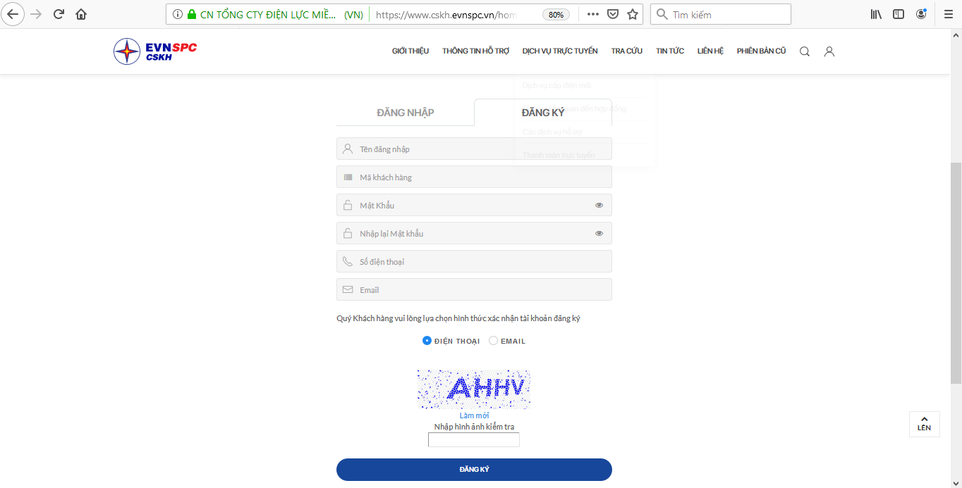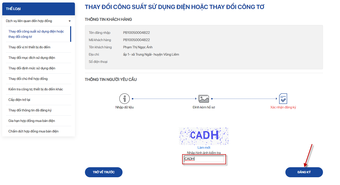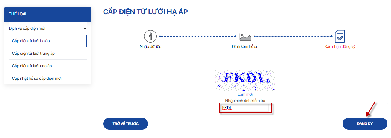 Cuối cùng đề hoàn tất đăng ký cấp điện, Khách hàng cần điền chính xác mã xác thực và bấm vào “ĐĂNG KÝ”