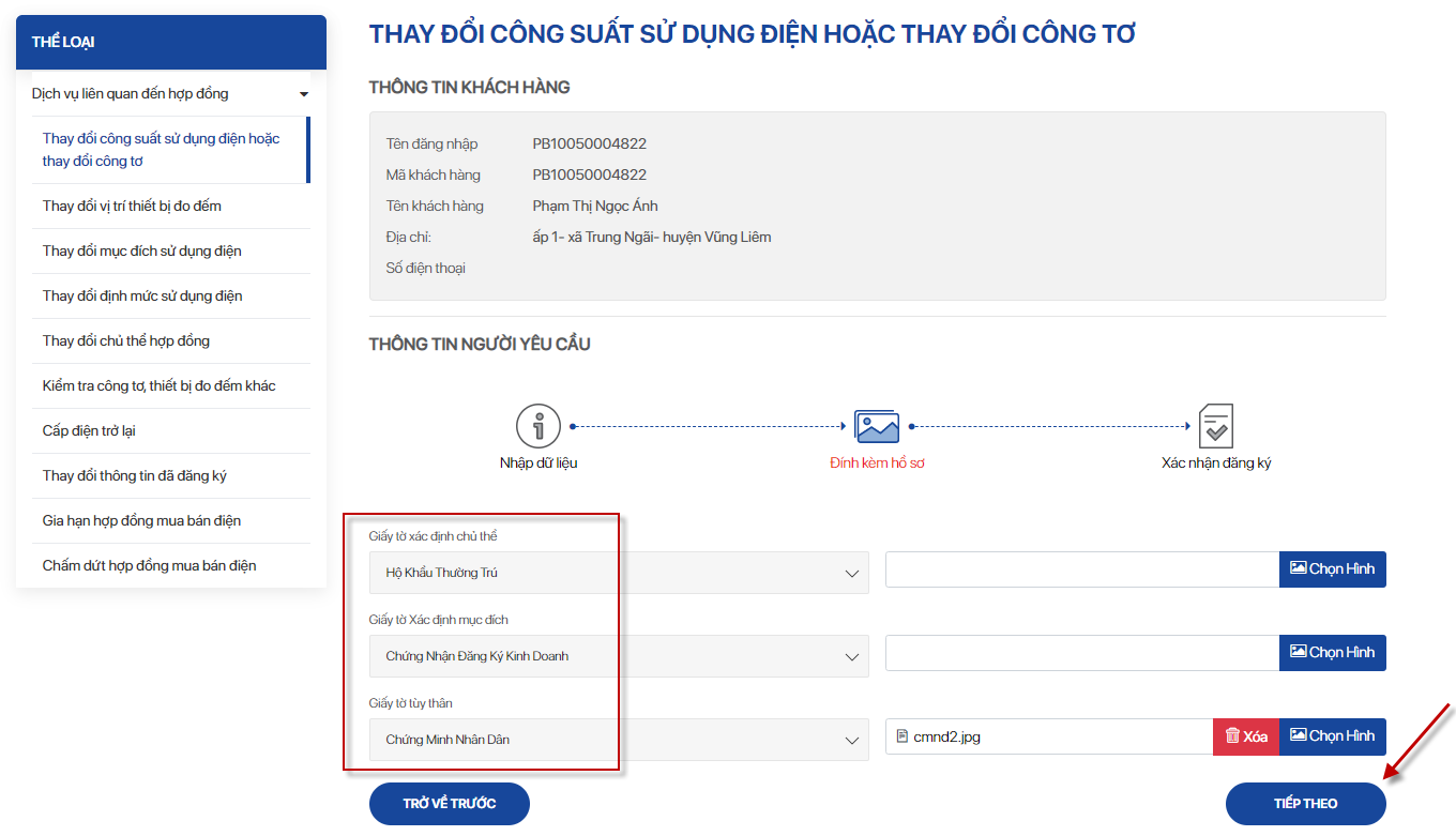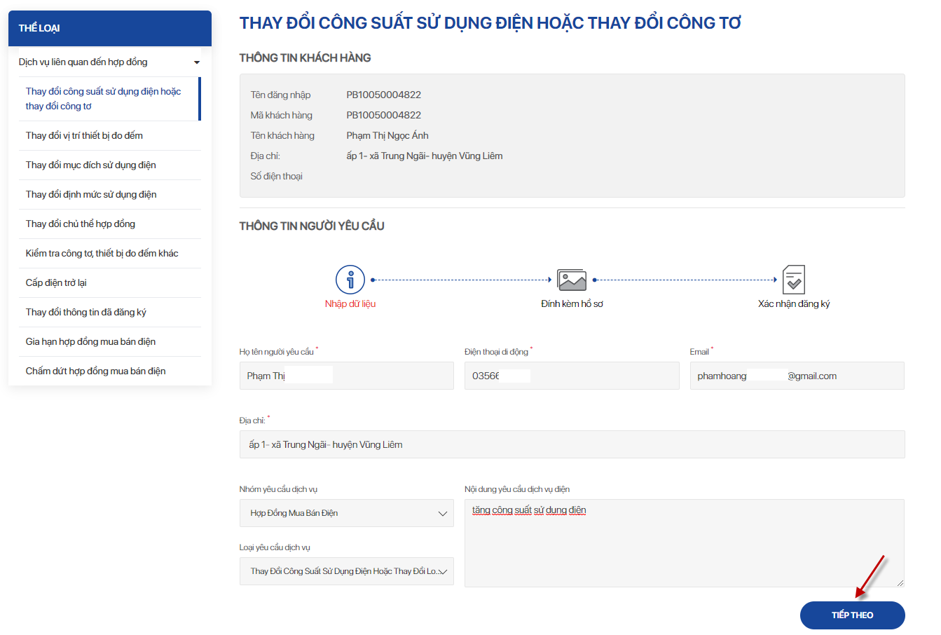 Khi có các yêu cầu liên quan đến hợp đồng mua bán điện: thay đổi công suất sử dụng điện hoặc thay đổi công tơ, thay đổi vị trí thiết bị đo đếm, thay đổi mục đích sử dụng điện, thay đổi định mức sử dụng điện, thay đổi chủ thể hợp đồng, kiểm tra công tơ, thiết bị đo đếm, cấp điện trở lại, thay đổi thông tin đã đăng ký, gia hạn hợp đồng, chấm dứt hợp đồng Khách hàng vào “Dịch vụ liên quan đến hợp đồng” điền đầy đủ thông tin và bấm vào “TIẾP THEO”