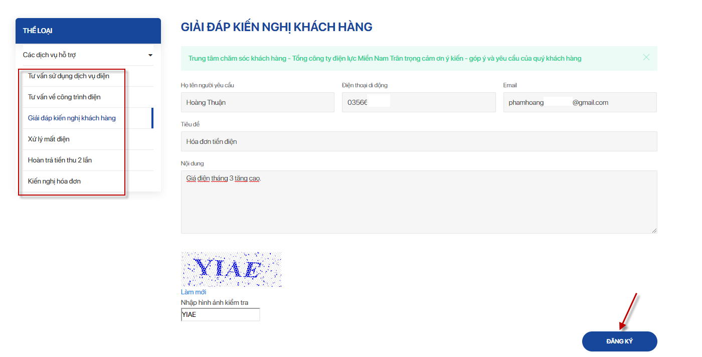 Trong phần này sẽ hỗ trợ tư vấn cách sử dụng các dịch vụ điện hay tư vấn về công trình điện. Khi có kiến nghị cần giải đáp Khách hàng có thể chọn đúng các phần như tùy chọn bên trái, điền đầy đủ thông tin, nhập mã xác nhận và bấm vào“ĐĂNG KÝ” để gửi yêu cầu về Trung tâm để được xử lý kịp thời