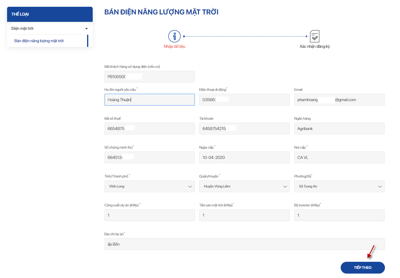 Khi có nhu cầu bán điện năng lượng mặt trời áp mái, Khách hàng vào phần “Bán điện năng lượng mặt trời”, điền đầy đủ thông tin theo yêu cầu và bấm vào “TIẾP THEO”