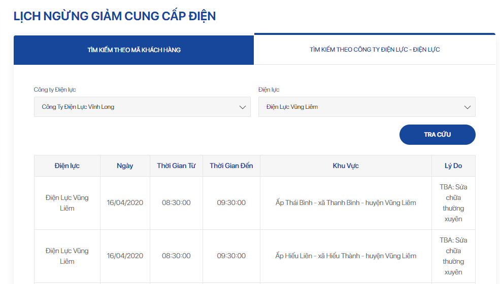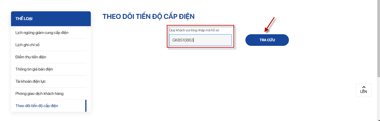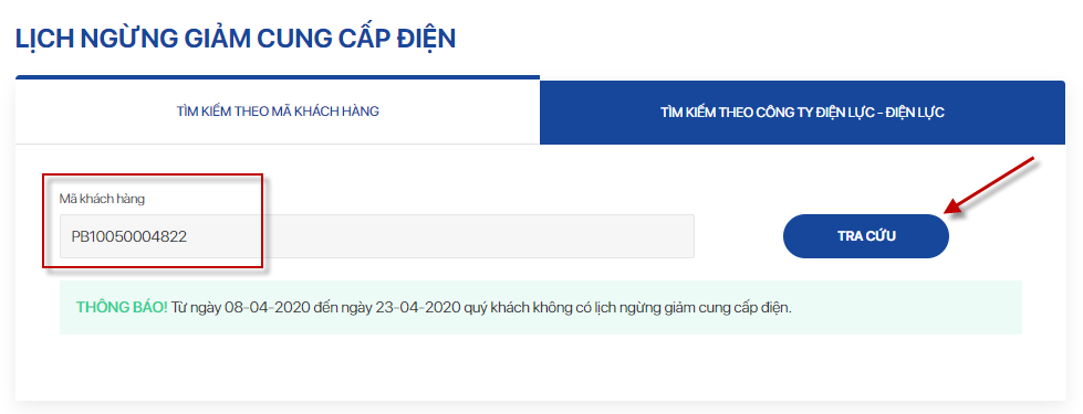 Khách hàng có thể tra cứu theo mã Khách hàng sử dụng điện, sau khi nhập mã Khách hàng và bấm vào “TRA CỨU”