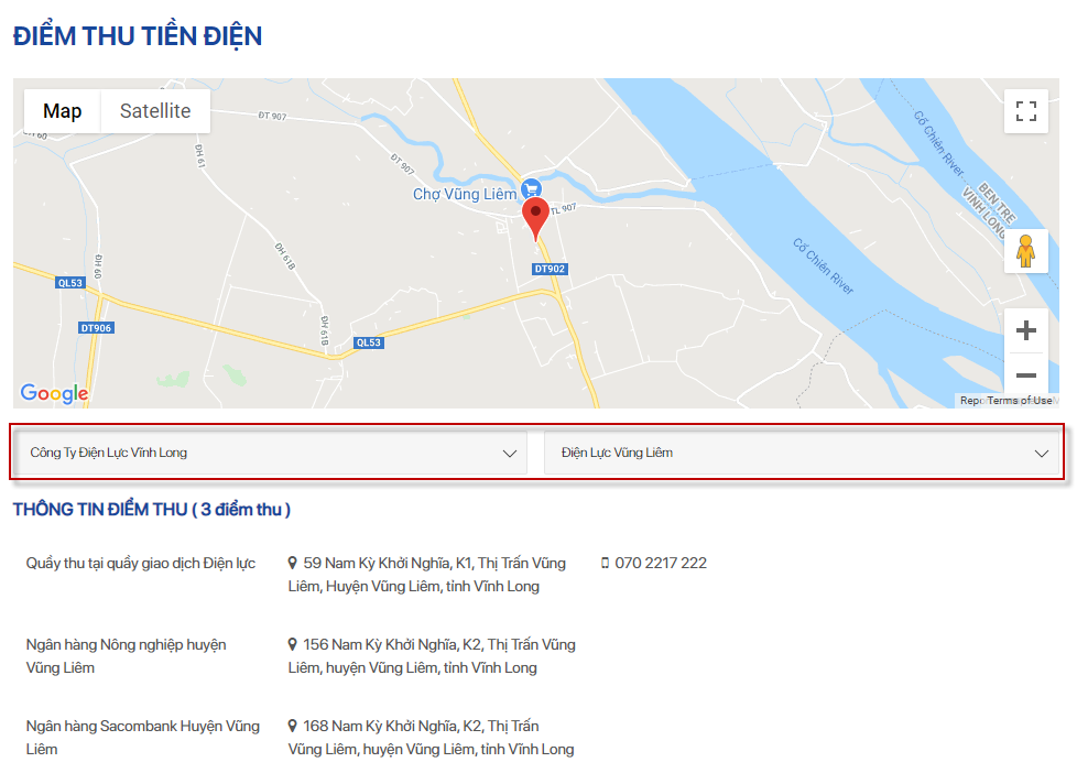 Khách hàng cần chọn công ty điện lực và Điện lực, tất cả điểm thu cần tra cứu sẽ hiển thị dưới phần tùy chọn
