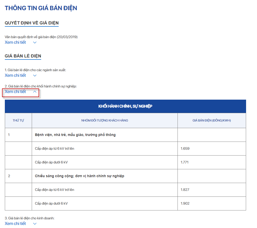 Thể hiện đầy đủ thông tin giá bán điện, văn bản quyết định về giá bán điện, nếu muốn biết thêm chi tiết, Khách hàng chọn vào phần “Xem chi tiết”