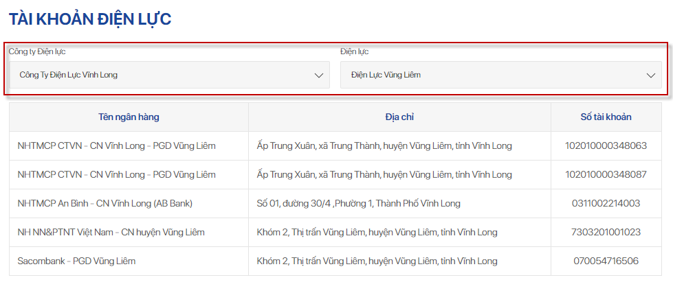 Để tra cứu tài khoản điện lực, Khách hàng cần chọn công ty Điện lực và Điện lực tương ứng, hệ thống sẽ tự động hiển thị các số tài khoản mà điện lực có