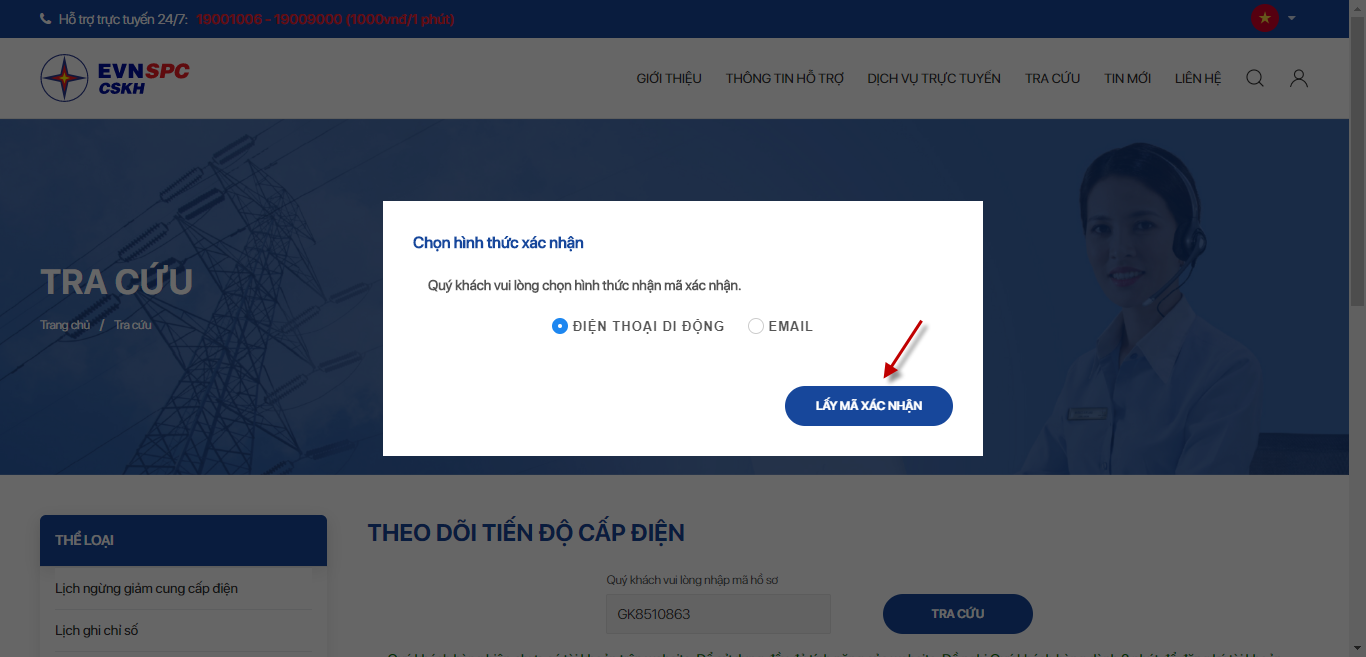 Xuất hiện hộp thoại xác nhận hiện lên, người dùng chọn một trong hai hình thức là số điện thoại hoặc email để nhận OTP xác thực tra cứu và bấm vào “LẤY MÃ XÁC NHẬN”.