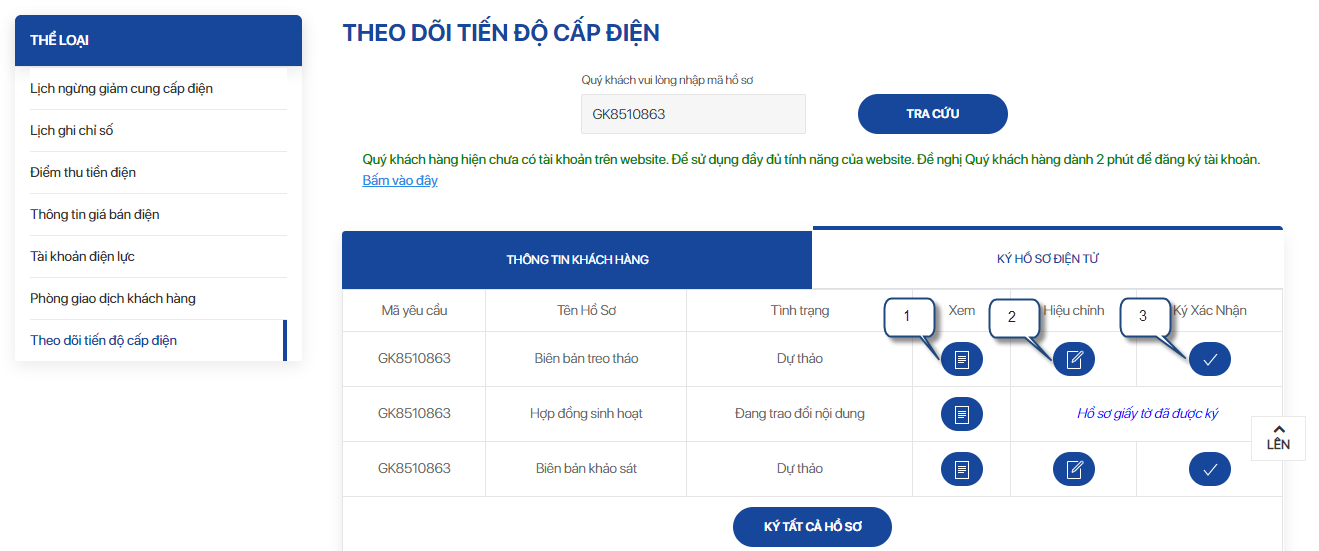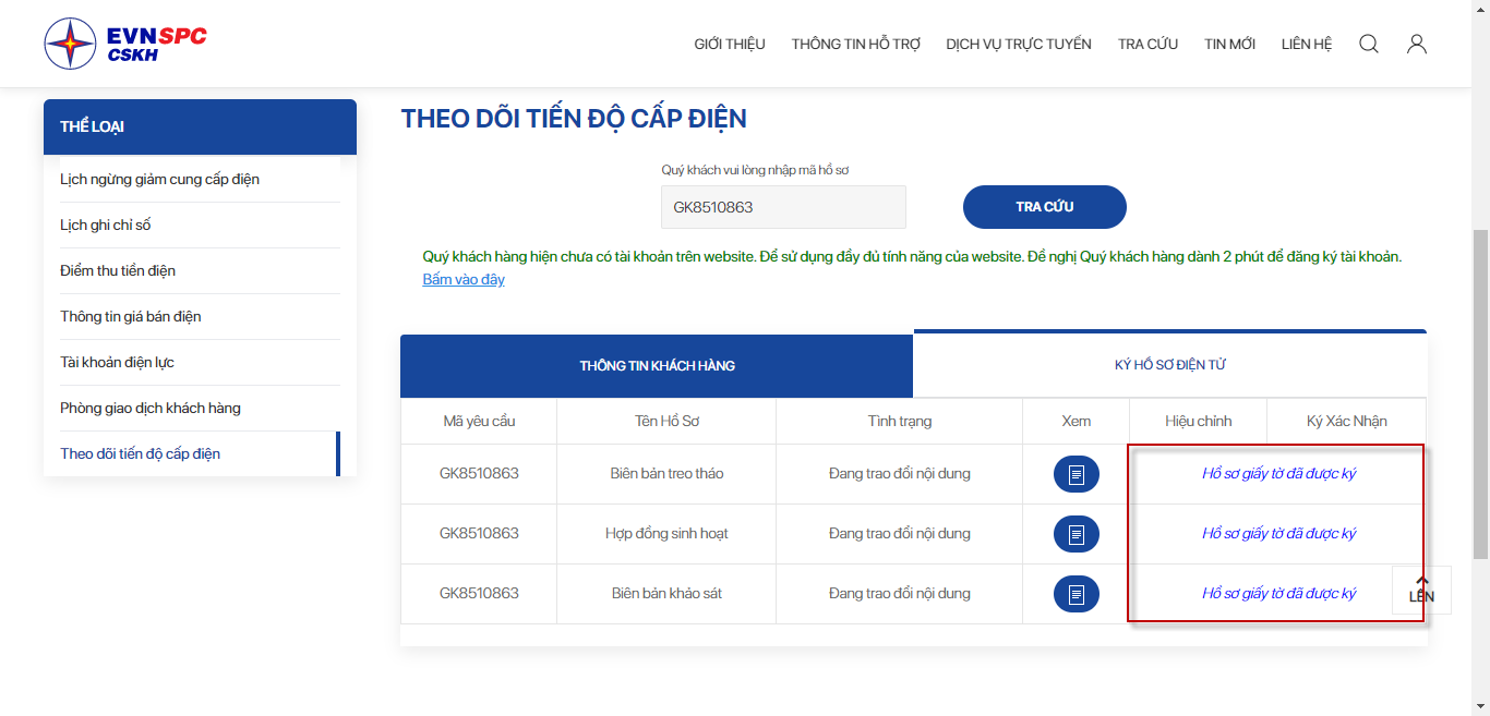 Các tra cứu cần phải đăng nhập là: chỉ số, tiền điện, hóa đơn, thông tin nợ tiền điện, thông tin thanh toán tiền điện, theo dõi tiến độ các dịch vụ khác, sản lượng điện mặt trời