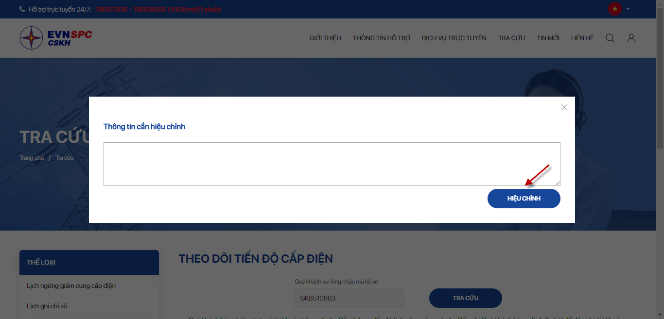 Sau khi ghi đầy đủ thông tin cần hiệu chỉnh hay góp ý về hồ sơ xong, Khách hàng bấm vào nút “HIỆU CHỈNH”, Website sẽ xuất hiện thông báo trả về cho Khách hàng để biết hệ thống đã ghi nhận
