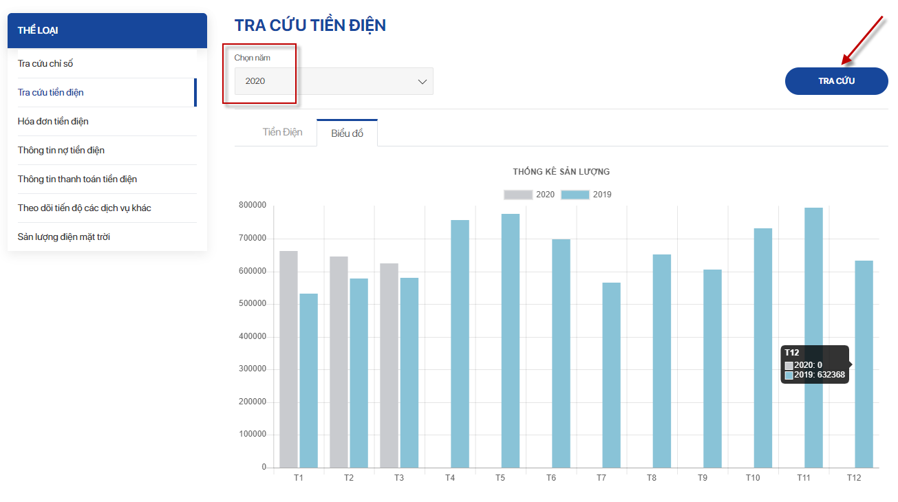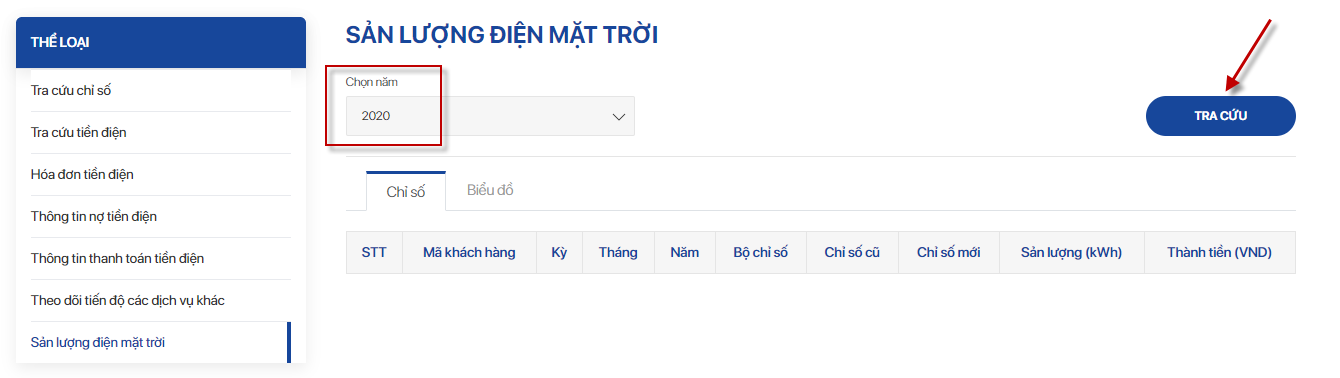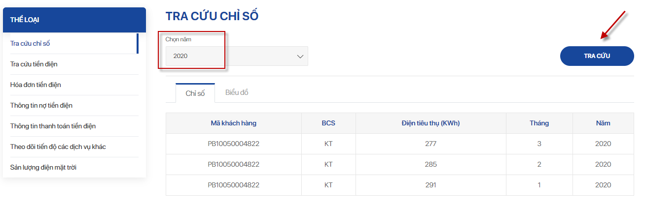 Khách hàng chọn năm cần tra cứu và bấm vào “TRA CỨU”, Khách hàng có thể xem chỉ số hoặc xem dạng biểu đồ