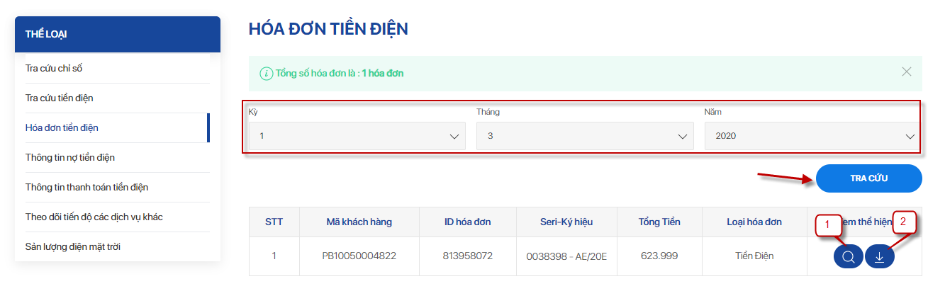 Khách cần chọn kỳ, tháng, năm cần tra cứu và bấm vào “TRA CỨU”, nếu muốn xem trực tiếp chọn vào số 1, tải về chọn số 2