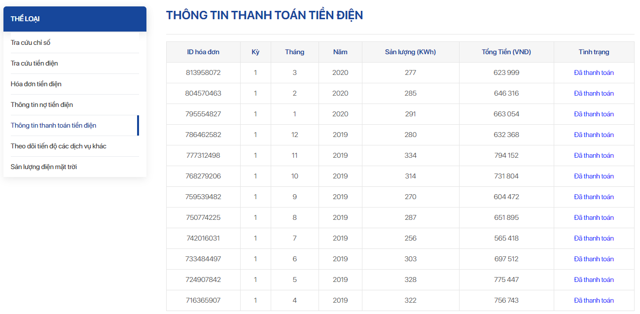 Khách hàng vào đây để xem thông tin đã thanh toán(12 tháng gần nhất)