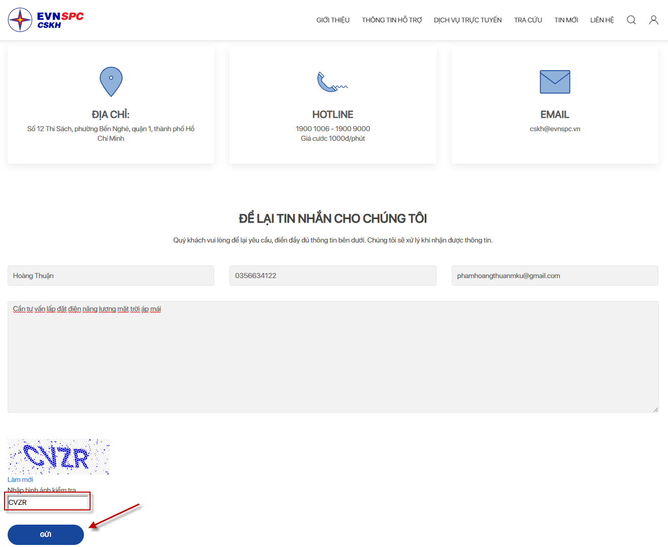 Khi cần hỗ trợ, Khách hàng cần điền đầy đủ thông tin, nhập mã xác nhận và bấm vào nút “GỬI”