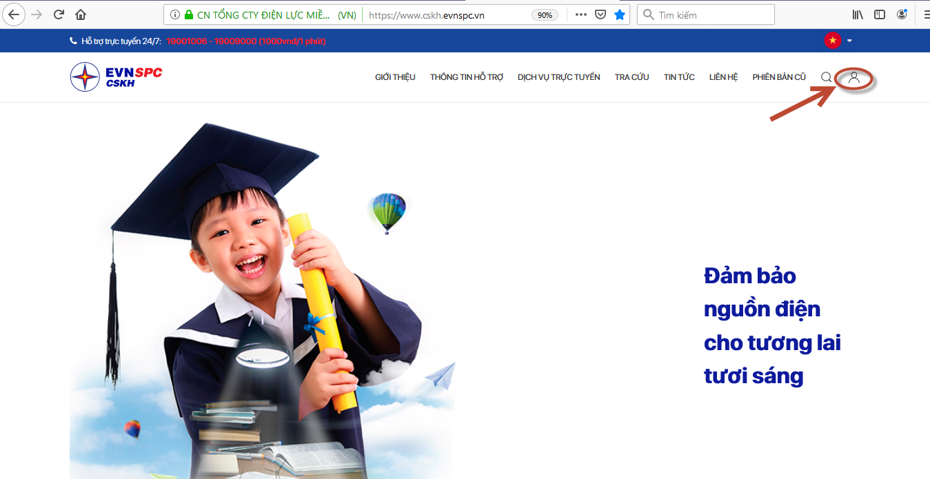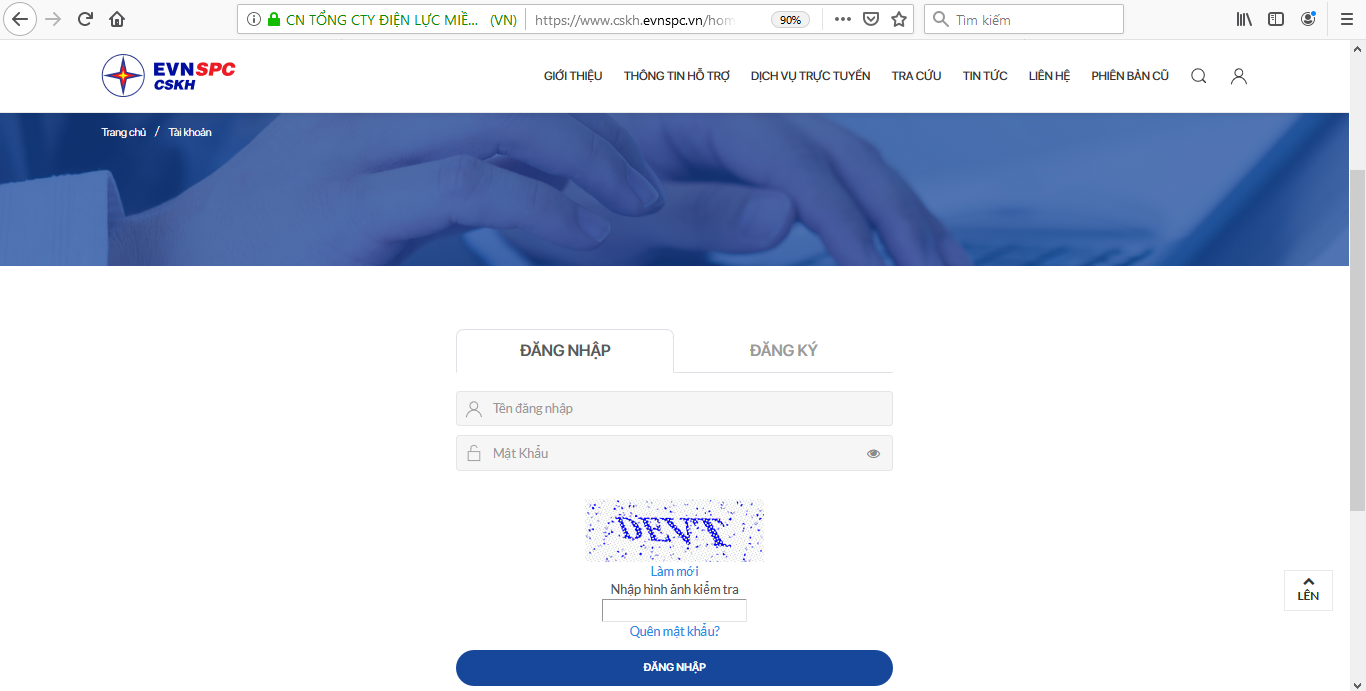 Để đăng nhập tài khoản website, Quý Khách cần phải vào địa chỉ: https://cskh.evnspc.vn/ và chọn vào biểu tượng như hình bên dưới để vào chức năng “Đăng nhập”. Quý Khách phải có tài khoản trên hệ thống mới thực hiện “Đăng nhập” vào hệ thống được.