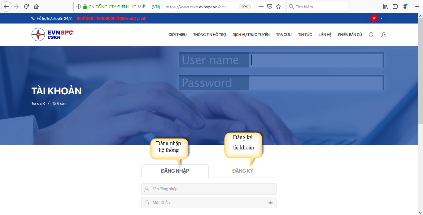 Nếu Khách hàng quên tài khoản đăng nhập, Khách hàng liên hệ tổng đài 19001006 – 19009000 để được hỗ trợ. Khi liên hệ, Khách hàng cần chuẩn bị thông tin tiền điện 02 tháng gần nhất.