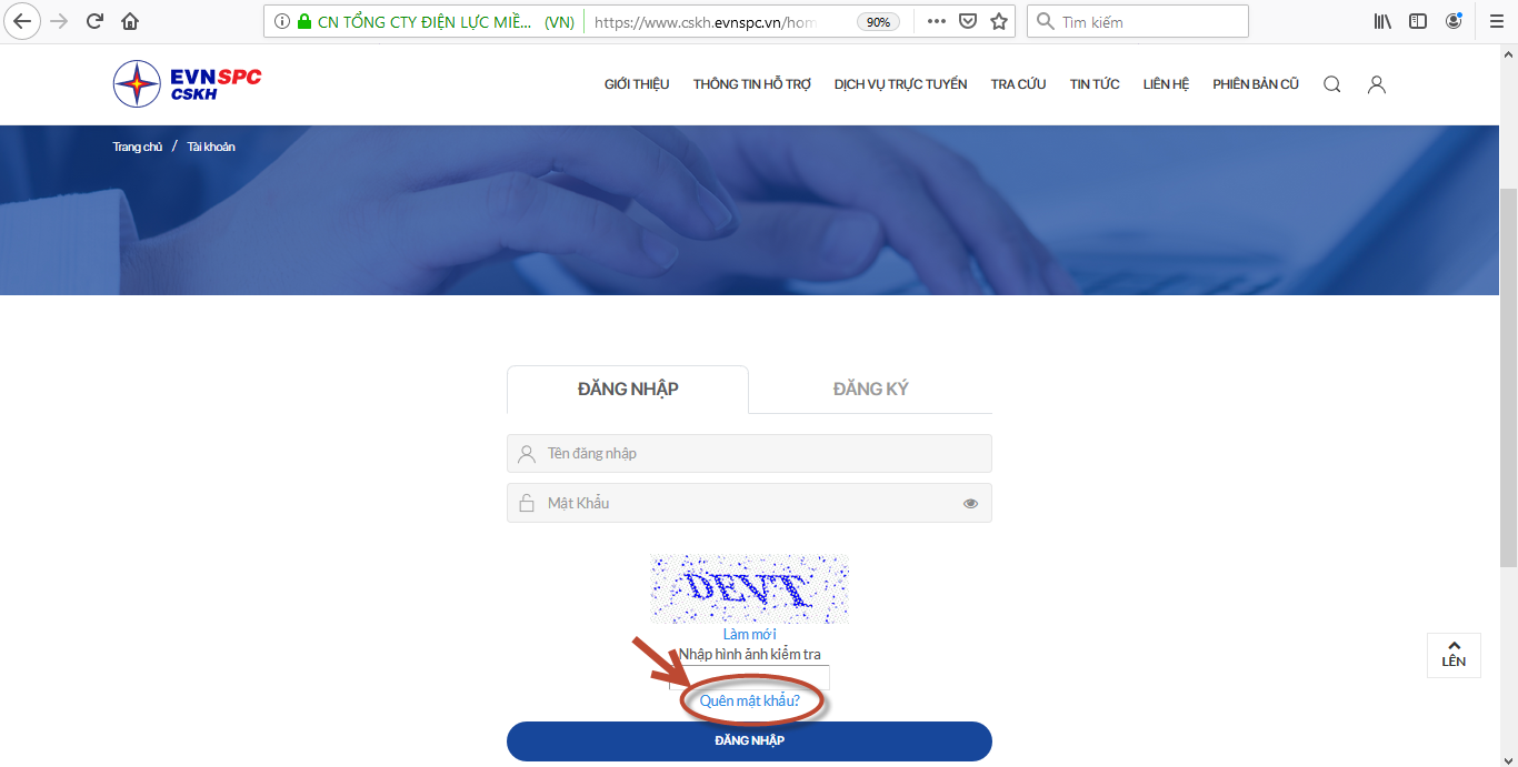 Nếu Khách hàng quên mật khẩu tài khoản đã đăng ký trước đó, Khách hàng có thể lấy lại mật khẩu của mình bằng cách bấm vào nút "Quên mật khẩu"