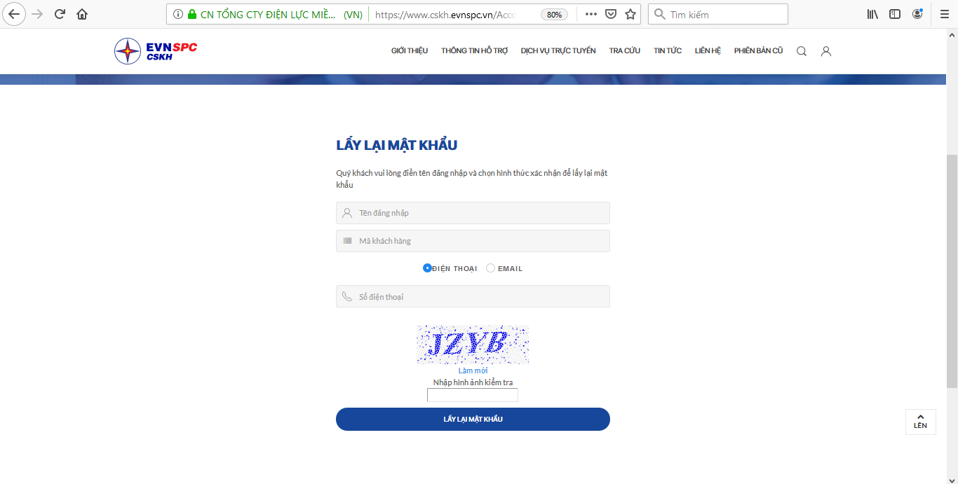 Tại đây Khách hàng phải nhớ chính xác "Tên tài khoản", “Mã khách hàng” (nếu có), chọn kênh liên lạc qua số điện thoại hay email, nhập số điện thoại/ địa chỉ email để hệ thống có thể gửi lại mật khẩu mới cho Khách hàng qua số điện thoại/email đã đăng ký, sau đó Khách hàng bấm vào nút "Lấy lại mật khẩu".