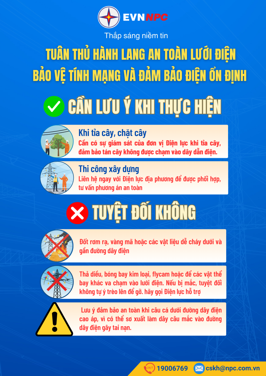 EVNNPC khuyến nghị người dân nâng cao ý thức an toàn điện. Chỉ một hành vi tưởng chừng đơn giản, vô hại như thả diều gần đường dây điện, đốt lửa gần đường dây điện hay câu cá dưới đường dây điện cao áp, nhưng có thể gây nguy hiểm đến tính mạng, thiệt hại tài sản và gây sự cố lưới điện.
