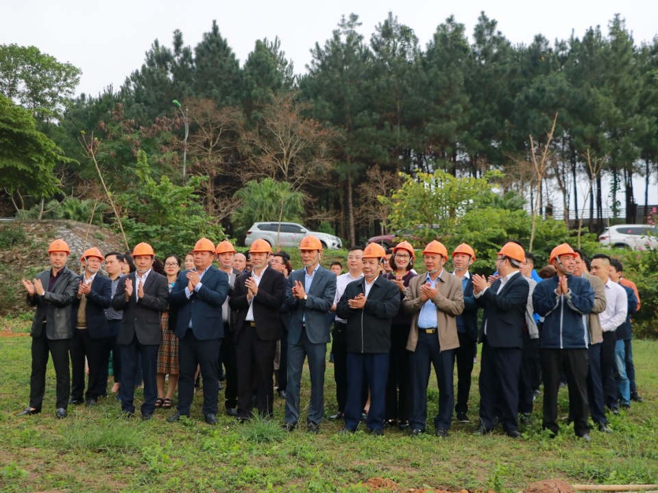 Các đại biểu chụp ảnh lưu niệm tại khu vực trồng cây của EVNNPC trong khuôn viên Làng Văn hóa - Du lịch các dân tộc Việt Nam (Ảnh: Đăng Quang)