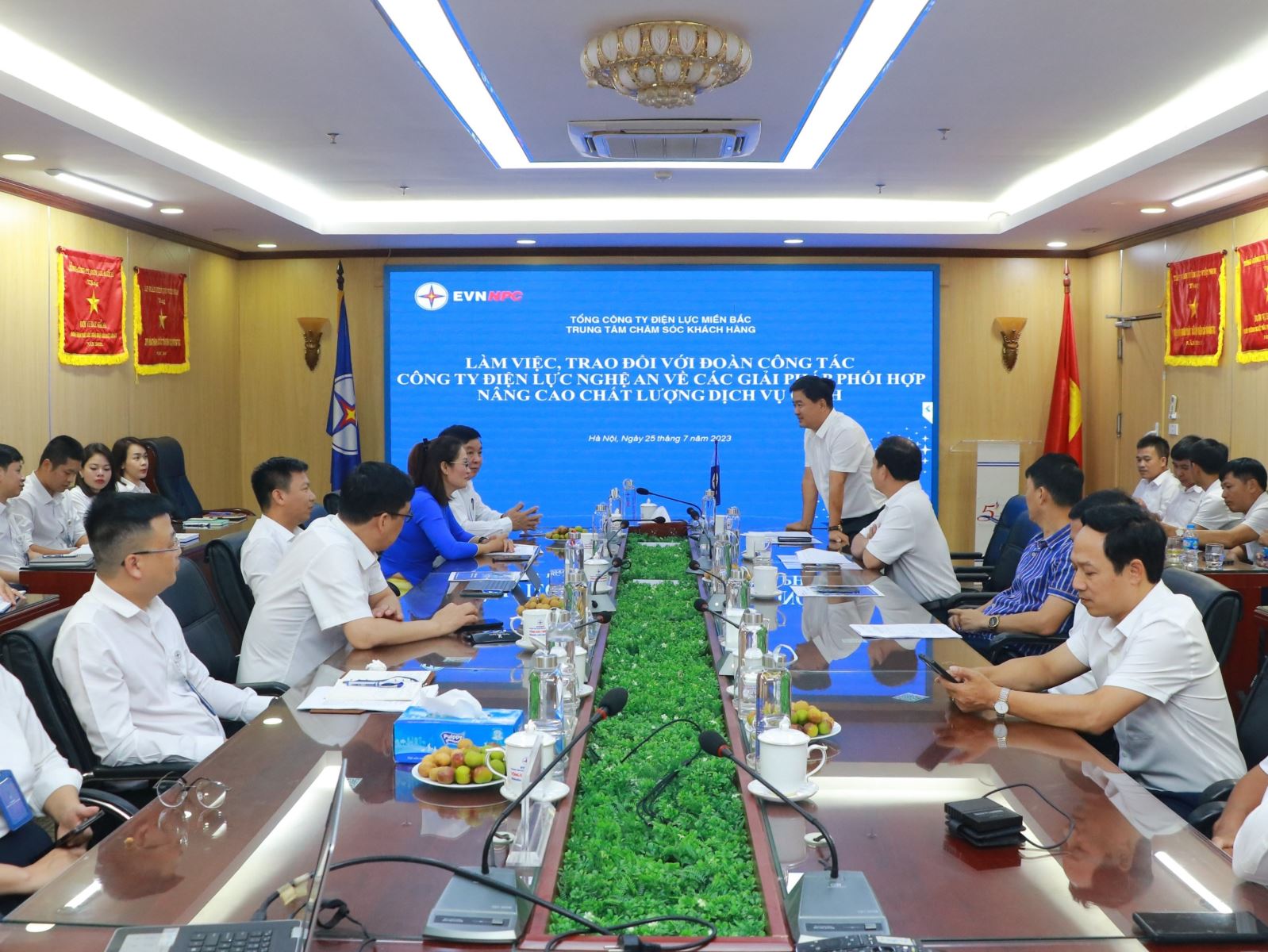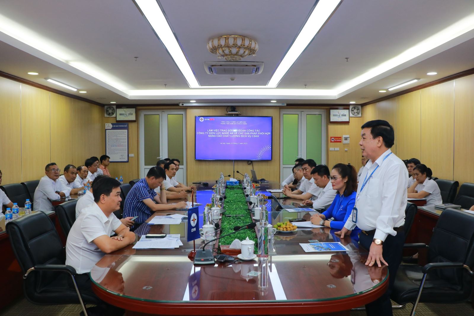 Ngày 25/7/2023, Công ty Điện lực Nghệ An đã làm việc, trao đổi kinh nghiệm về các giải pháp phối hợp nâng cao chất lượng dịch vụ CSKH tại Trung tâm Chăm sóc khách hàng (TTCSKH). Đoàn công tác do ông Phạm Văn Nga - Phó Giám đốc Công ty Điện lực Nghệ An (PC Nghệ An) làm trưởng đoàn.