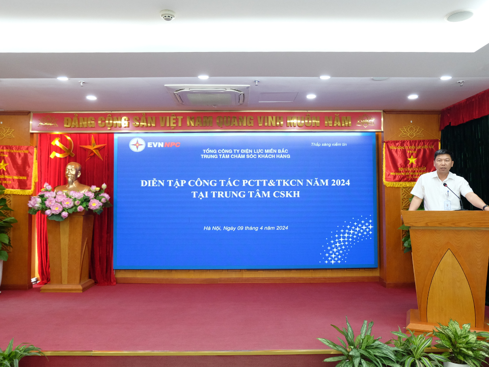 Phát biểu và chỉ đạo trực tiếp buổi diễn tập, Ông Trương Anh Quảng, Phó Giám đốc Trung tâm, Trưởng Ban chỉ huy PCTT&TKCN nhấn mạnh: Thông qua diễn tập lần này sẽ nâng cao khả năng chỉ huy, điều hành kỹ năng ứng phó sự cố thiên tai với phương châm ứng phó linh hoạt, xử lý kịp thời sự cố, giảm thiểu thiệt hại do thiên tai gây ra, đảm bảo công tác Chăm sóc khách hàng không bị gián đoạn. Đồng thời, là đơn vị chăm sóc khách hàng, một trong các đầu mối cung cấp thông tin đến khách hàng về cung cấp điện, an toàn điện nên diễn tập PCTT&TKCN không chỉ nằm trong giới hạn địa lý của Trung tâm mà còn diễn tập CSKH ứng phó với các tình huống sự cố lưới điện của 27 tỉnh phía Bắc. Đây cùng là dịp để thực tập phương án CSKH mùa nắng nóng, mưa bão năm 2024 tốt nhất, đặc biệt các diễn tập quản lý, vận hành hệ thống Tổng đài, đường truyền dẫn khi thiên tai, bão lụt xảy ra.