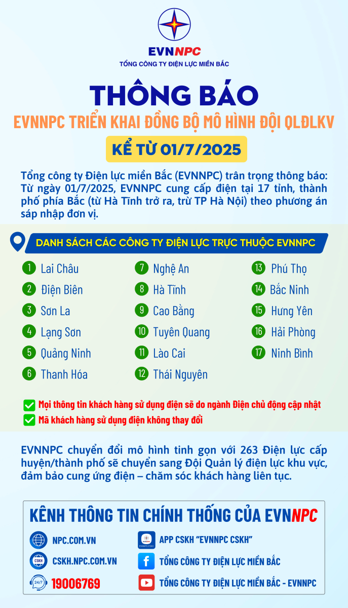 Từ ngày 01 tháng 7 năm 2025, Tổng công ty Điện lực miền Bắc (EVNNPC) chính thức triển khai mô hình Đội Quản lý điện lực khu vực (QLĐLKV), thay thế mô hình Điện lực cấp huyện. Đây là bước chuyển đổi quan trọng trong lộ trình tinh gọn tổ chức, giúp bộ máy hoạt động hiệu quả hơn, tiếp cận gần hơn với khách hàng và đáp ứng kịp thời mọi nhu cầu về điện cũng như các dịch vụ điện lực.