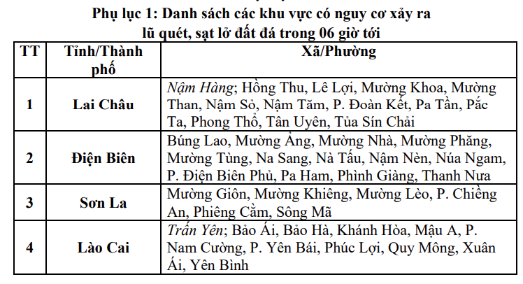 Trong 06 giờ tới, nguy cơ xảy ra lũ quét trên các sông, suối nhỏ, sạt lở đất trên sườn dốc tại nhiều xã/phường (Chi tiết được đính kèm trong trong Phụ lục 1).