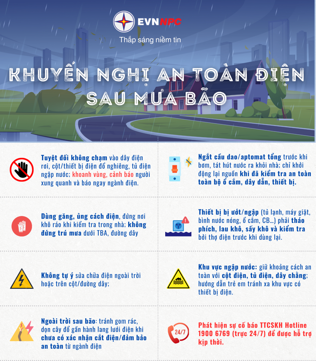 Để bảo đảm an toàn trong mùa mưa bão, EVNNPC đề nghị người dân chủ động phòng tránh các nguy cơ tai nạn điện trong gia đình và khu dân cư. Việc nâng cao ý thức sử dụng điện an toàn sẽ góp phần bảo vệ chính mình, gia đình và cộng đồng.