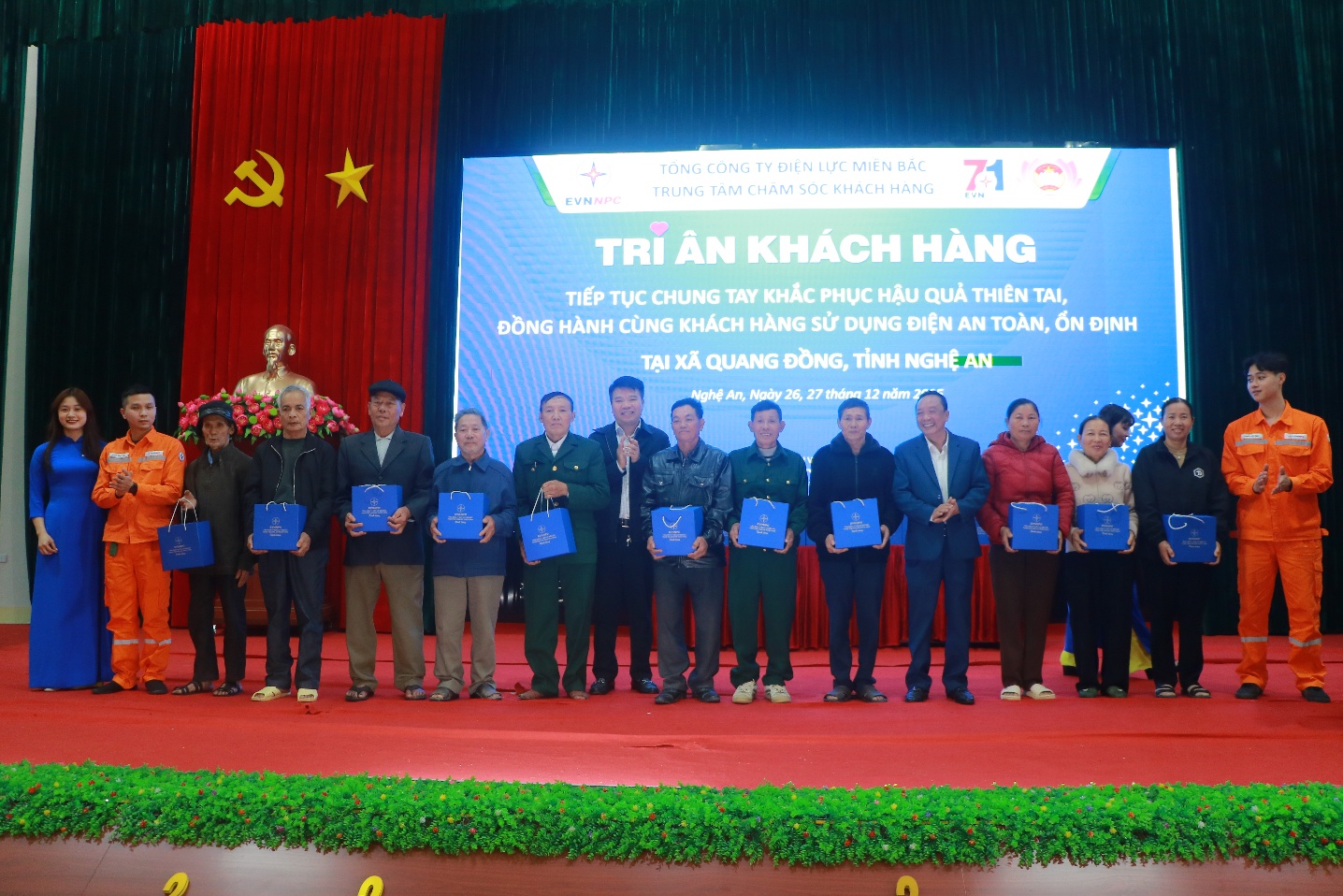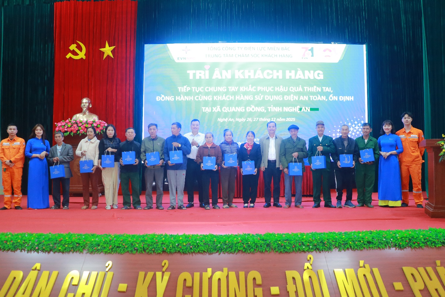 Chiều ngày 26/12/2025, Trung tâm Chăm sóc khách hàng Tổng công ty Điện lực miền Bắc (EVNNPC) đã phối hợp với Ủy ban Mặt trận Tổ quốc xã Quang Đồng, tỉnh Nghệ An tổ chức chương trình tri ân khách hàng gắn với hoạt động an sinh xã hội trên địa bàn xã. Chương trình được tổ chức nhân dịp kỷ niệm 71 năm Ngày truyền thống ngành Điện lực Việt Nam (21/12/1954 – 21/12/2025) và 10 năm Trung tâm Chăm sóc khách hàng EVNNPC chính thức đi vào hoạt động.