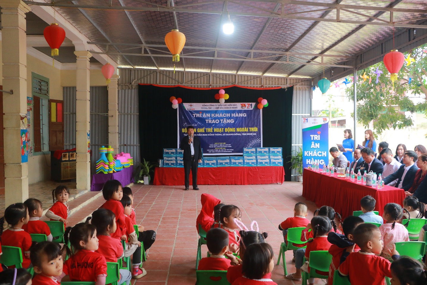 Trong khuôn khổ chương trình, Đoàn đã đến thăm Trường Mầm non Đồng Thành và trao quà hỗ trợ là bàn học mới và sữa dinh dưỡng cho nhà trường, góp phần giúp đỡ nâng cao điều kiện cơ sở vật chất, chăm sóc tốt hơn cho các cháu mầm non.
