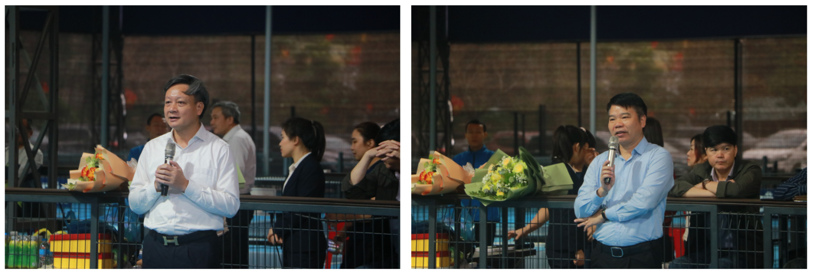 Ông Nguyễn Quang Quân – Bí thư Đảng ủy, Giám đốc Công ty Dịch vụ Điện lực miền Bắc (bên trái) và ông Trịnh Quang Minh – Bí thư Đảng ủy, Giám đốc Trung tâm Chăm sóc khách hàng (bên phải) phát biểu tại chương trình giao lưu