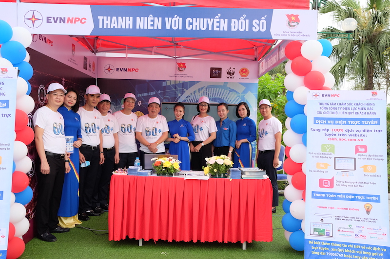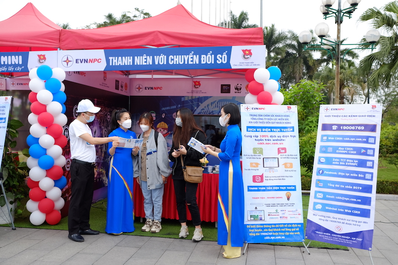 Tại sự kiện, Trung tâm Chăm sóc khách hàng – Tổng công ty Điện lực miền Bắc đã phối hợp cùng PC Hải Phòng và Đoàn Thanh niên Tổng công ty lập các quầy thanh niên với chuyển đổi số, Siêu thị xanh mini “Đổi giấy lấy cây”, phát tờ rơi, tem sán, poster, in và phát miễn phí tài liệu hướng dẫn khách hàng sử dụng điện an toàn, tiết kiệm và hiệu quả, quảng bá giới thiệu đến khách hàng sử dụng điện các kênh CSKH như: Số tổng đài 19006769, App CSKH “EVNNPC CSKH”, hệ thống Chatbot tự động qua Website, Zalo, Facebook CSKH…để khách hàng có thể giao dịch và được hỗ trợ các dịch vụ điện mọi lúc, mọi nơi trên nền tảng số.