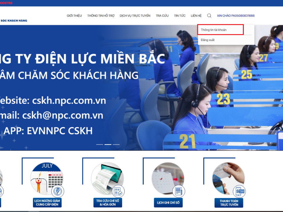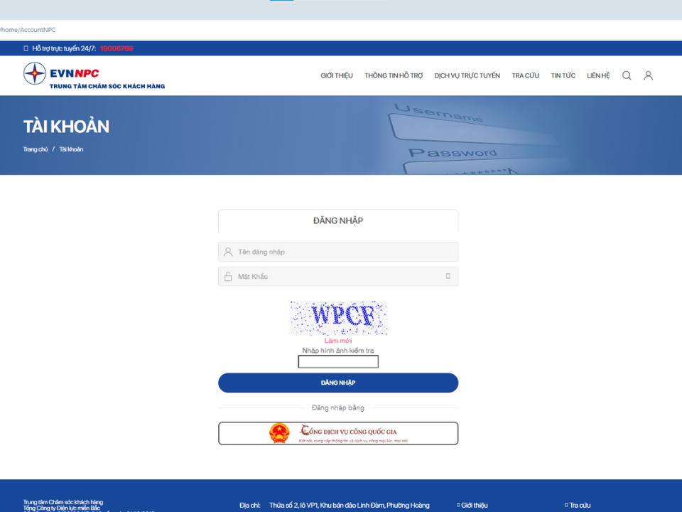 Giao diện Wesbite Chăm sóc khách hàng (địa chỉ: cskh.npc.com.vn)