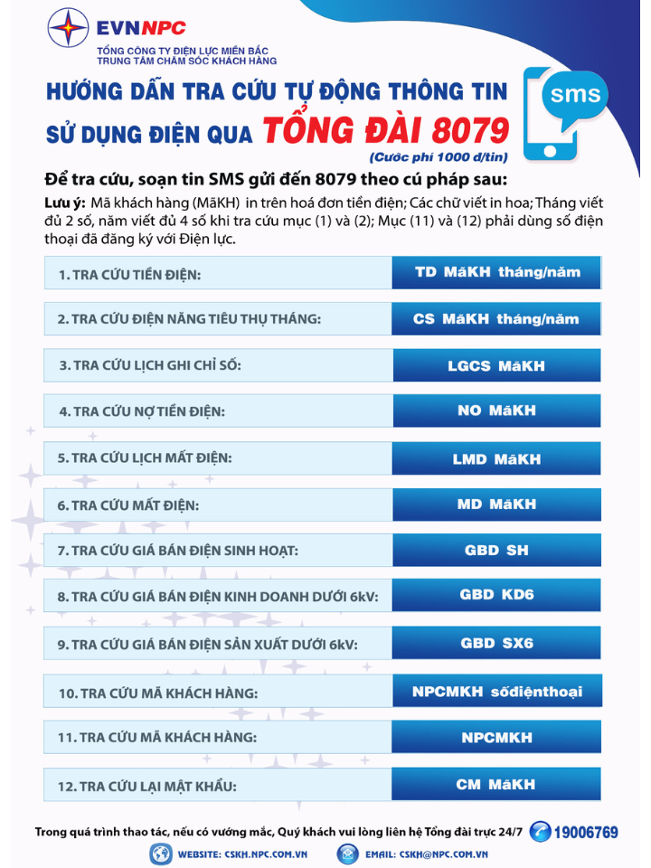 8. Nhắn tin SMS tra cứu qua Tổng đài tin nhắn: 8079 (Khách hàng sử dụng số điện thoại đăng ký nhận tin nhắn dịch vụ điện với ngành điện, nhắn tin theo cú pháp gửi đến 8079).
