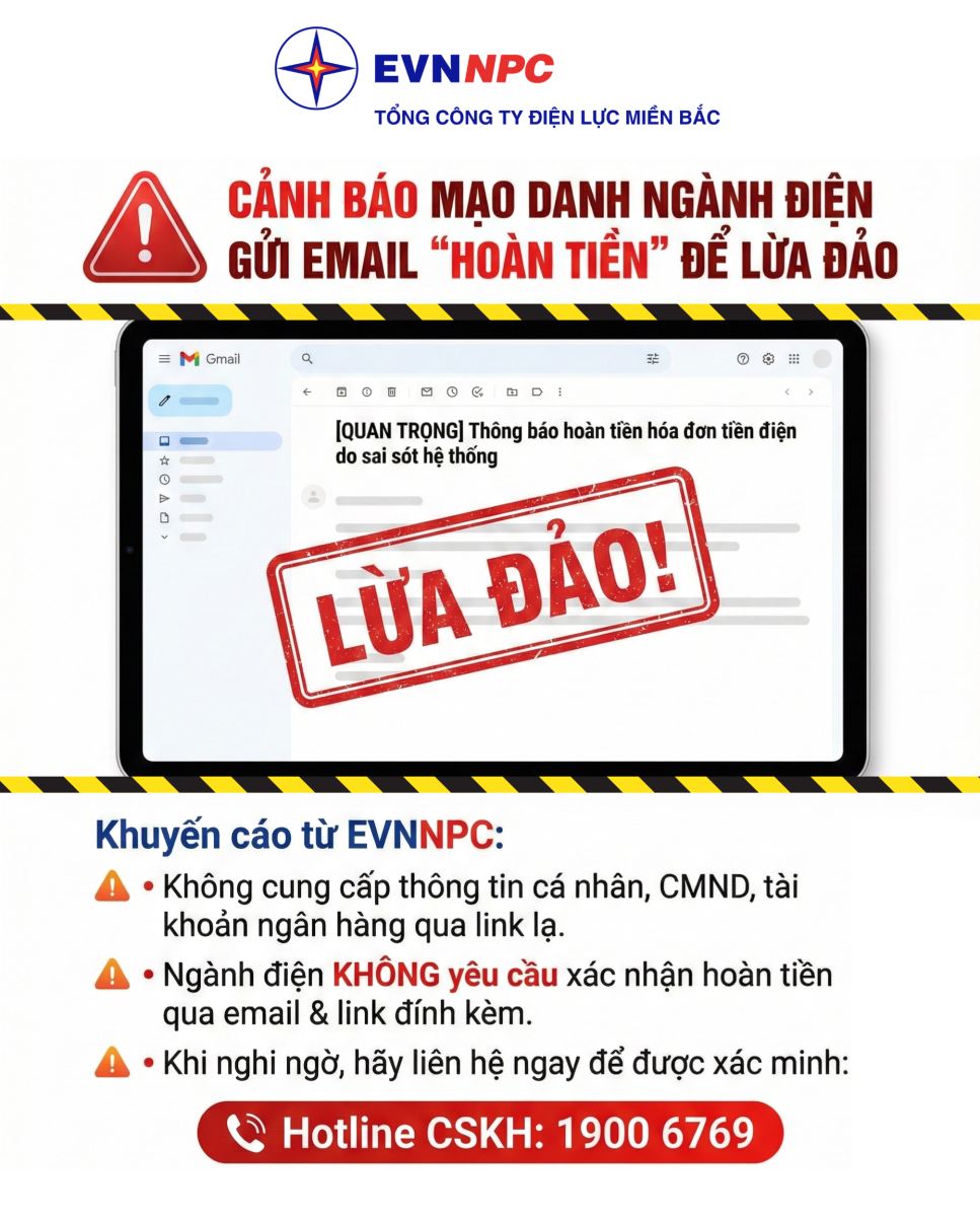 Tổng công ty Điện lực miền Bắc (EVNNPC) cảnh báo: Gần đây xuất hiện email giả mạo ngành điện, mạo danh “EVN CSKH” với tiêu đề “[QUAN TRỌNG] Thông báo hoàn tiền hóa đơn tiền điện do sai sót hệ thống” nhằm dụ khách hàng bấm link và cung cấp thông tin để chiếm đoạt tài sản.
