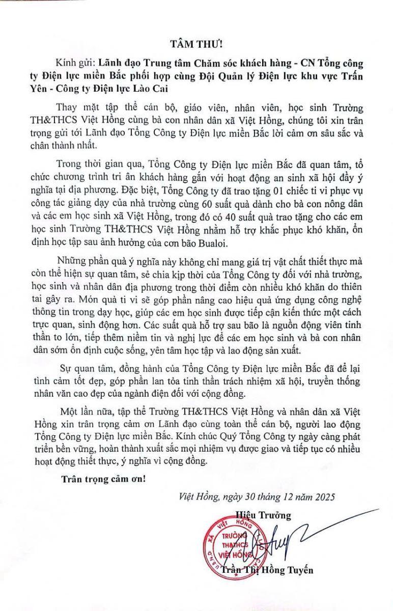 Đặc biệt, tại tỉnh Lào Cai, đoàn công tác đã nhận được tâm thư đầy xúc động của tập thể cán bộ, giáo viên và học sinh Trường Tiểu học và THCS Việt Hồng, xã Việt Hồng. Trong tâm thư, nhà trường bày tỏ: “Những phần quà và sự quan tâm của Tổng công ty Điện lực miền Bắc không chỉ có giá trị vật chất, mà còn là nguồn động viên tinh thần to lớn đối với thầy và trò nhà trường, tiếp thêm niềm tin và động lực để chúng tôi vượt qua khó khăn, nỗ lực dạy tốt - học tốt”. Những dòng chia sẻ mộc mạc, chân thành ấy đã để lại nhiều cảm xúc sâu sắc đối với đoàn công tác.