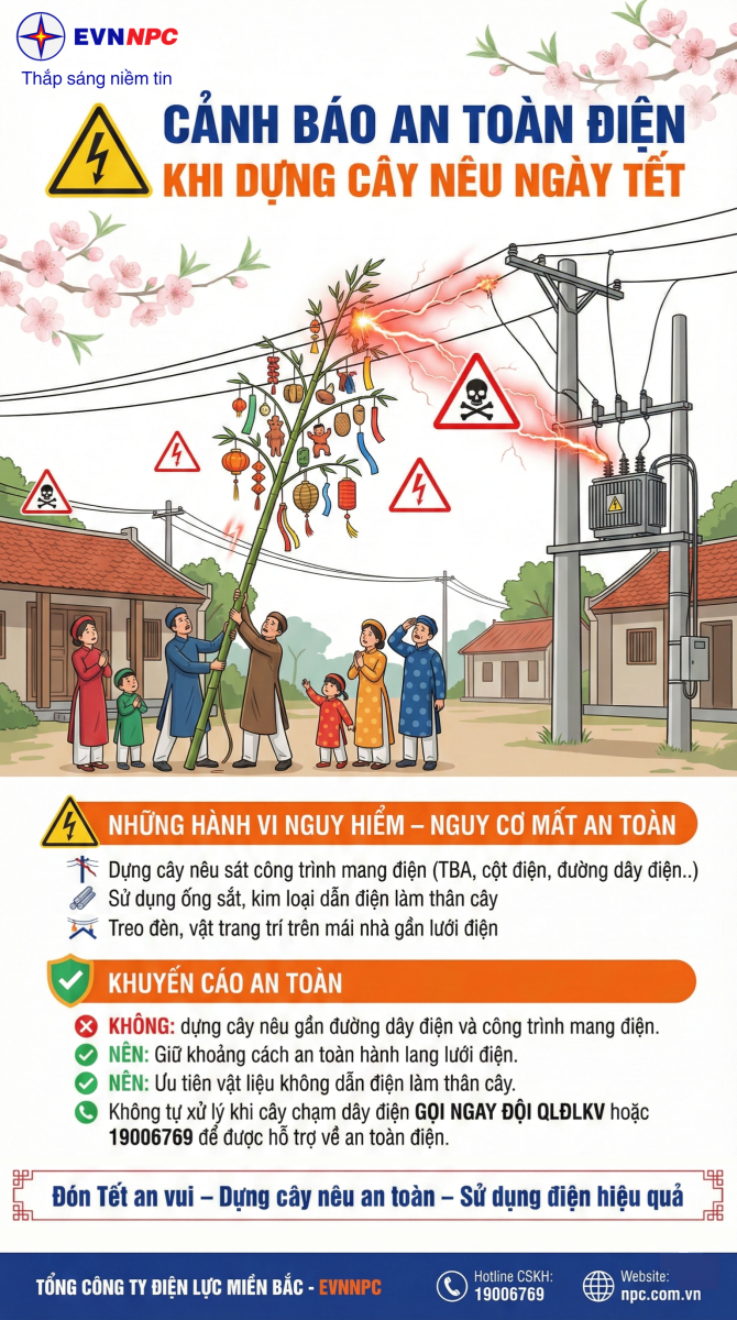 🏮 Tết đến, dựng cây nêu là nét đẹp truyền thống mang ý nghĩa cầu bình an, may mắn. Nhưng nếu dựng cây nêu sai vị trí – đặc biệt gần đường dây điện và các công trình mang điện – thì “bình an” có thể biến thành rủi ro chỉ trong tích tắc.